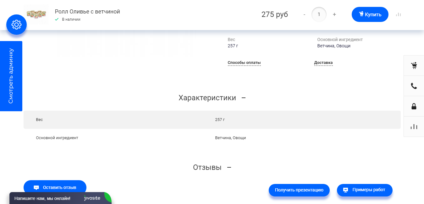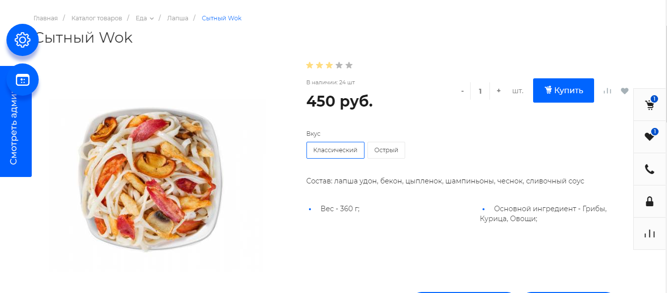 Дополнительные изображения в плитке «Еда» позволят продемонстрировать продукцию с разных сторон. Это очень важно, т.к. клиент хочет видеть, что именно он покупает. Вы можете выводить информацию об ингредиентах, энергетической ценности, весе.