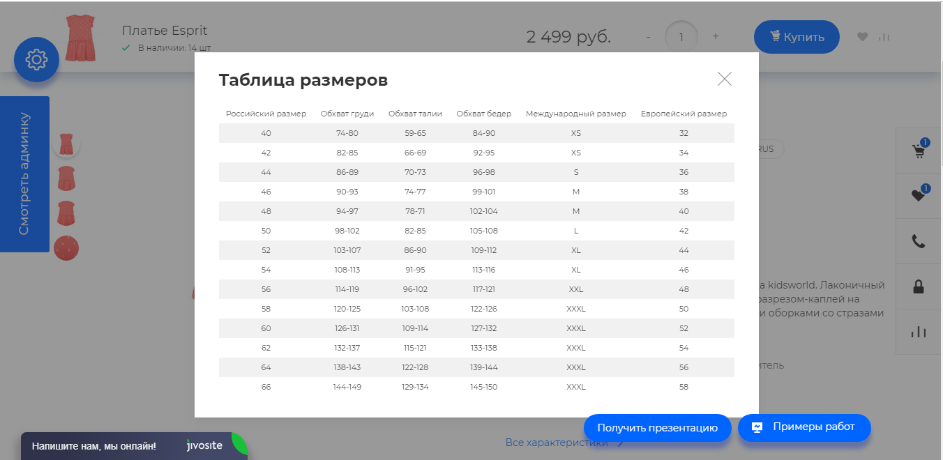 Для каталога одежды мы предусмотрели таблицу размеров для того, чтобы, зная свои параметры, мерки одежды, и, видя перед глазами таблицу размеров, потенциальный клиент смог без особого труда выбрать необходимую вещь.