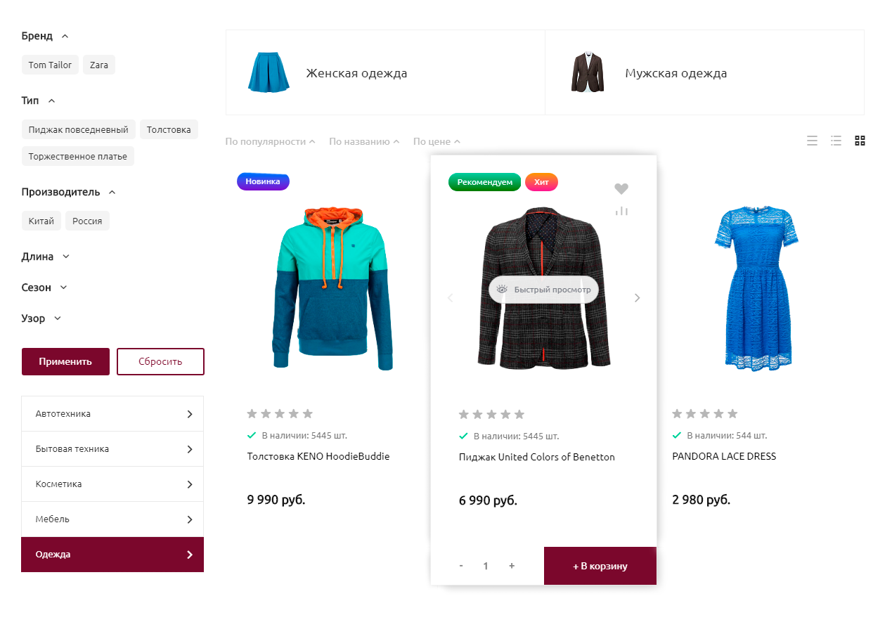 Как вы знаете, чем меньше времени уходит у посетителя интернет-магазина на то, чтобы добавить товар в корзину – тем лучше. Поэтому мы обновили в INTEC:UNIVERSE функцию «Быстрый просмотр»( старый шаблон также доступен), которая позволяет увидеть более подробную информацию о товаре, не переходя на его страницу.