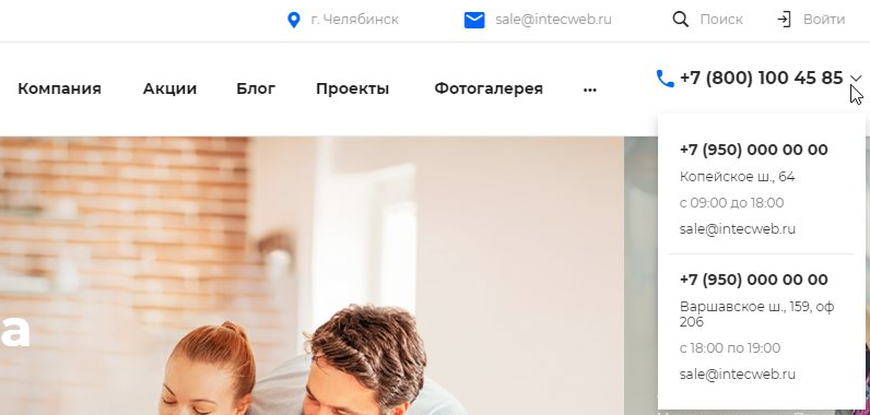 Появилась возможность указывать расширенные сведения в окнах при наведении на телефон в шапке (адрес, почту, время работы). Раньше для отображения контактов в шапке необходимо было заполнить данную информацию в каждом шаблоне, теперь информация подтягивается автоматически из раздела «Контакты».