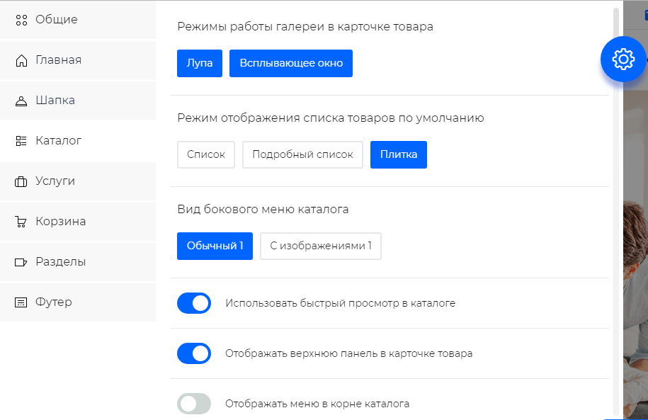 В обновленной шестеренке появились возможности выбора шрифта, который будет применен на всем сайте, выбор подключаемой карты в разделе Контакты(Яндекс или Гугл), выбор области поиска - по каталогу или по совпадению слов на всем сайте, настройки летающей корзины и обновленные шаблоны для внутренних страниц сайта.